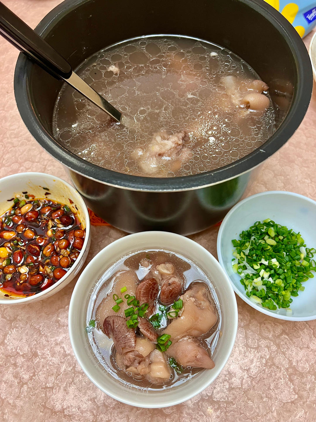 用蹄圈煮了一锅蹄花汤,蘸着青椒酱吃【这里的青椒酱浇的是热油】
