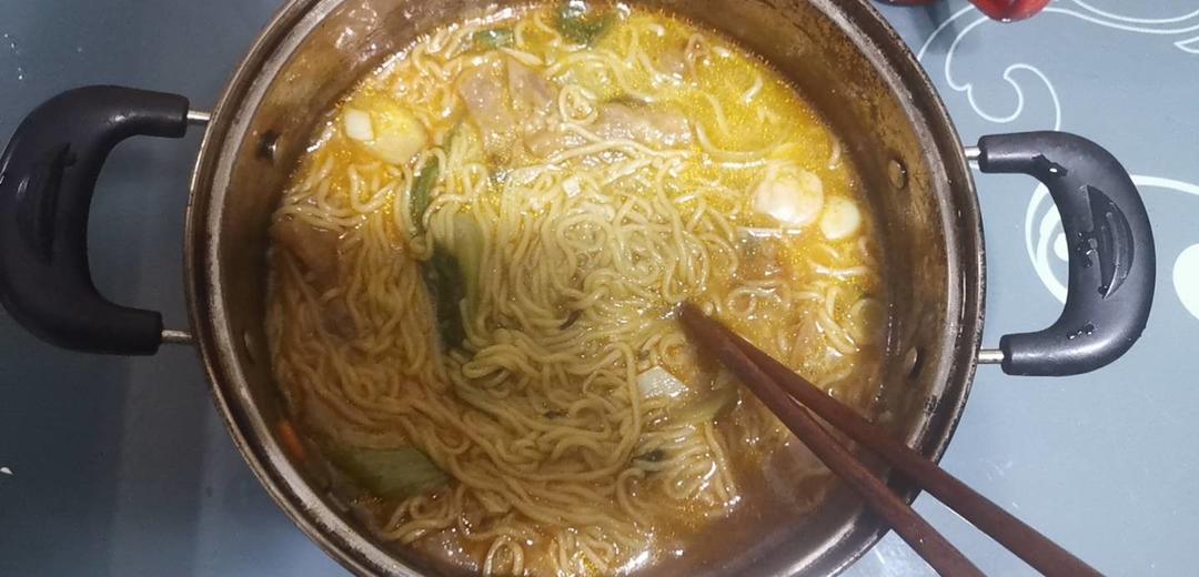 咖喱面是在香港阿信屋买的。虽然是二人份。不过调料包,面条都是分成两份的。所以...