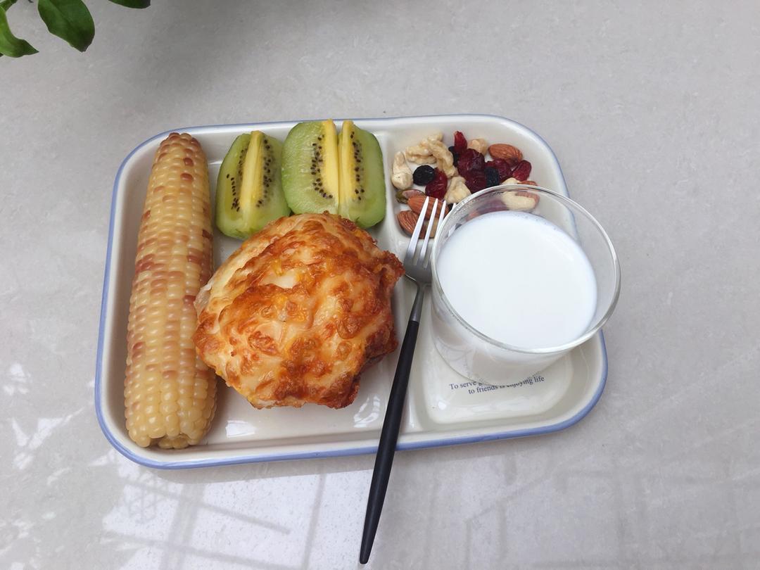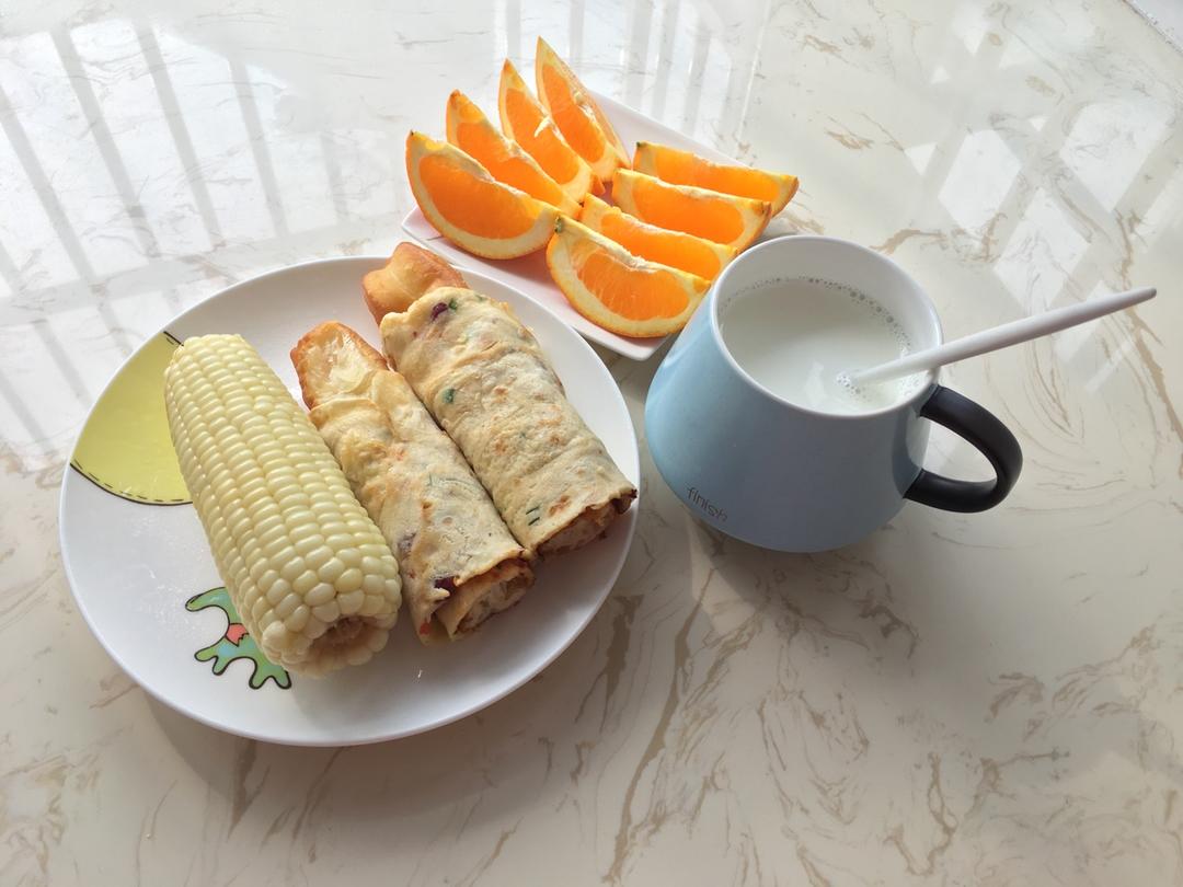 油条鸡蛋饼、玉米🌽、牛奶🥛、橙子🍊。