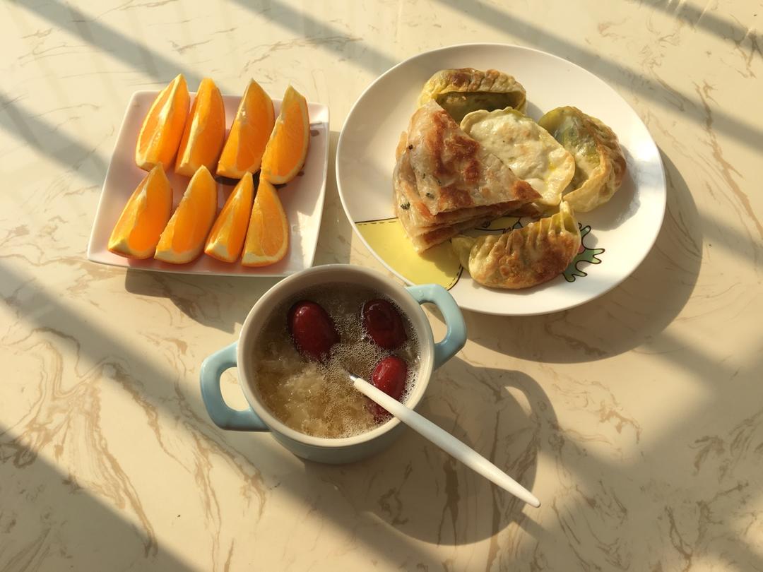 手抓饼、韭菜煎饺、红枣银耳汤、橙子🍊。
