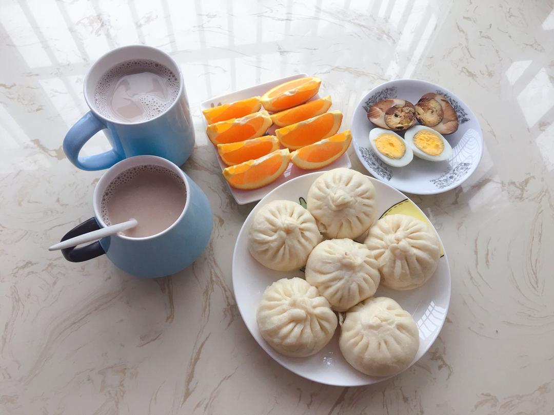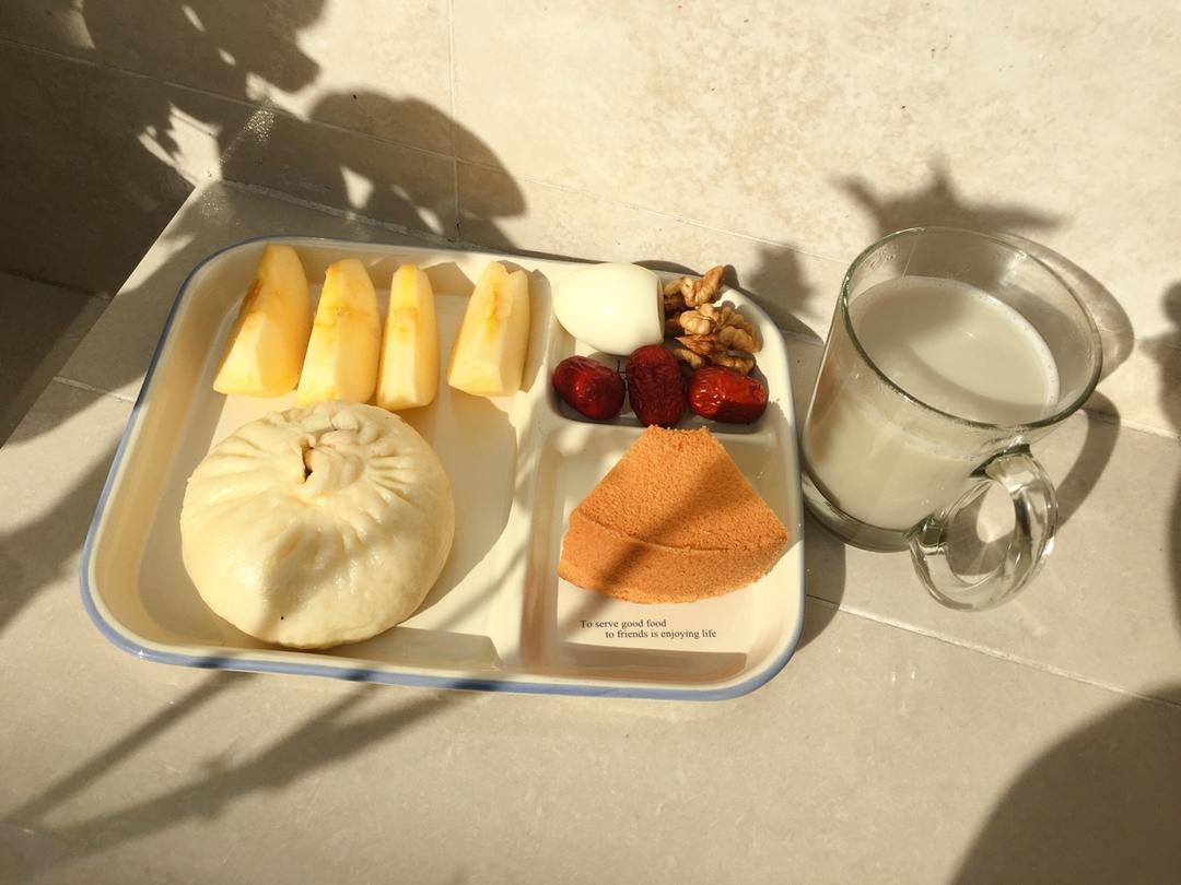 豆沙包、水煮蛋、戚风蛋糕、豆浆、苹果🍎、红枣、核桃
