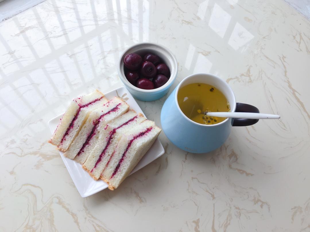 蓝莓果酱吐司、百香果茶、车厘子。
