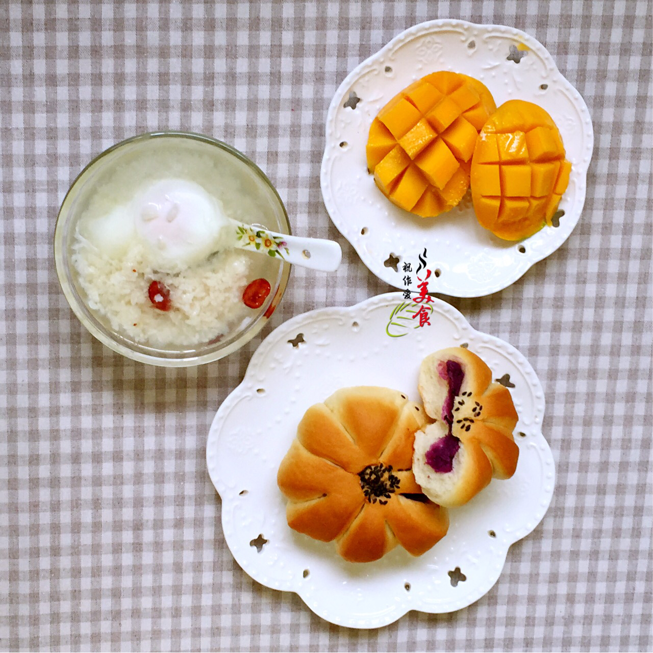 周二早上好,春天来点带春意的早餐吧!紫薯花包、蔓越梅酒酿(自制)鸡蛋、芒果。