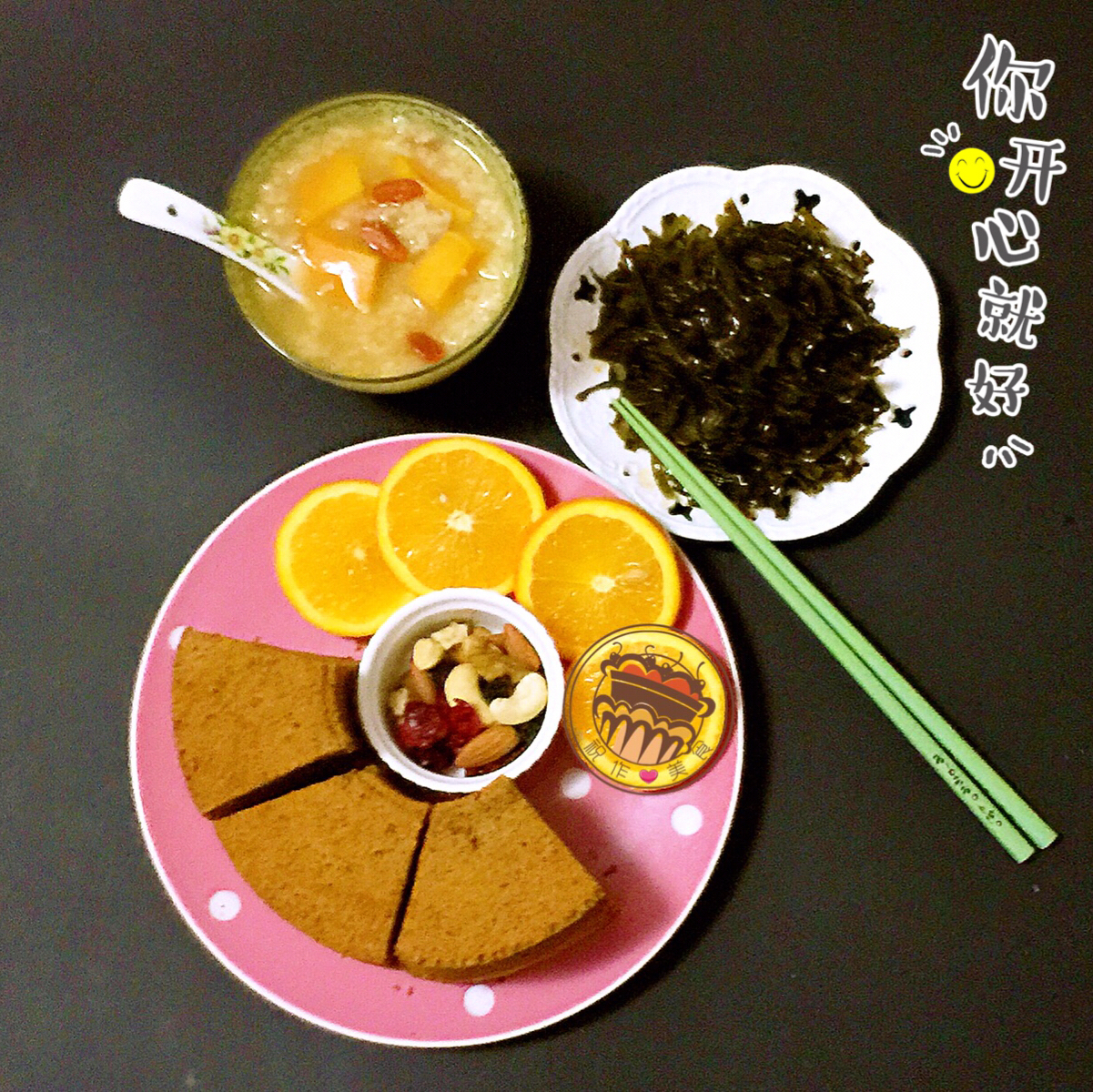 周一早上好,红糖枣泥戚风蛋糕、红薯枸杞三米粥(小米大米糯米)、海带丝、橙子、每日坚果。
