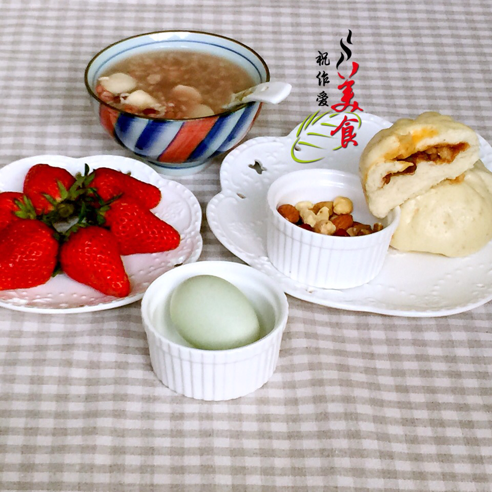 周四早上好,全麦酱肉包子、山药薏米红豆粥、绿壳蛋、每日坚果和草莓。