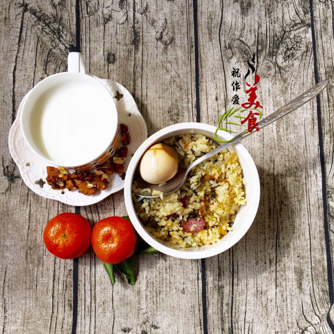 周五早上好,香肠菜饭、牛奶、鸡蛋、核桃和砂糖桔