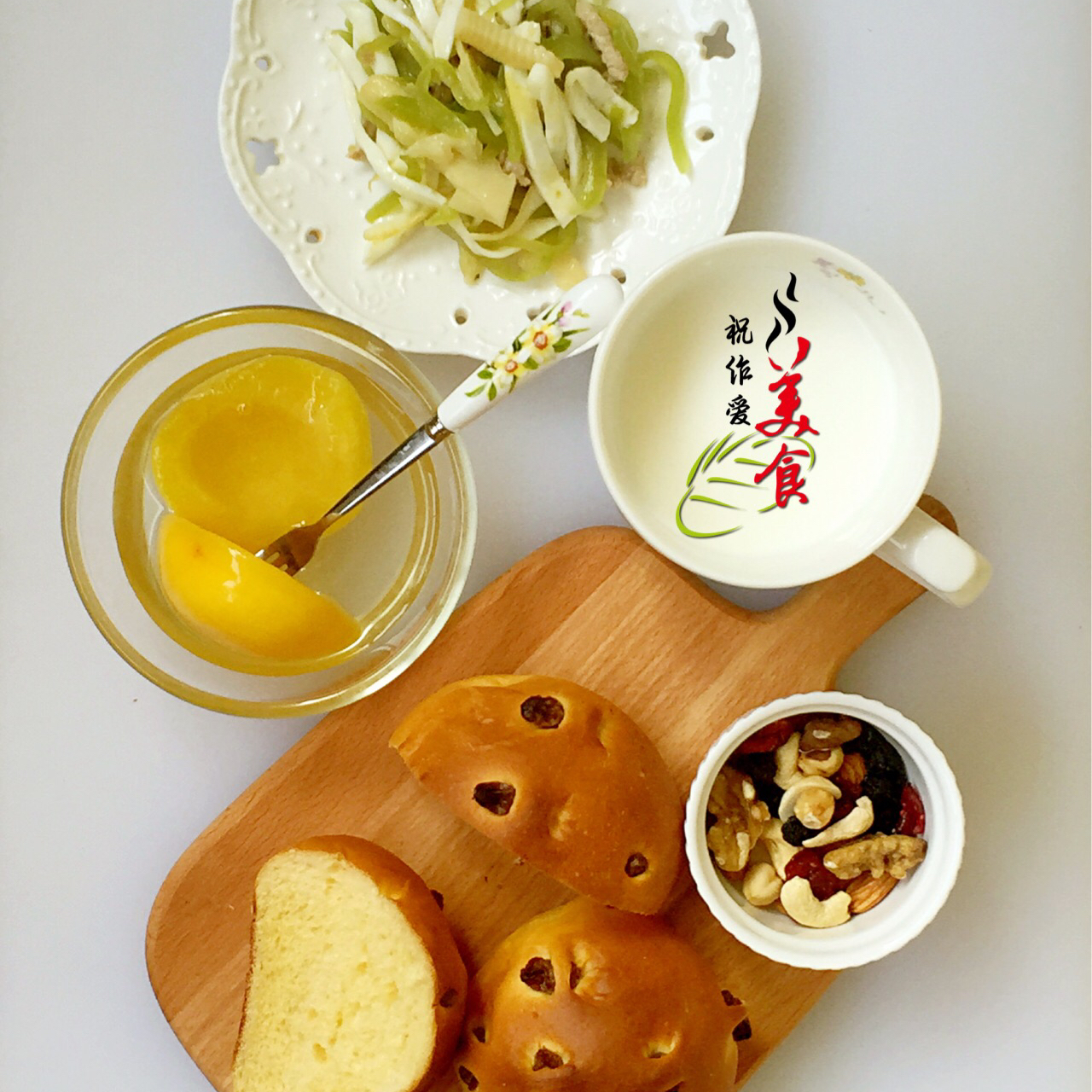 周三早上好,今日早餐蛋黄饽饽小餐包(没吃过吧[呲牙])、竹笋莴笋凉拌蛋白丝、坚果、牛奶和黄桃。 #早餐•...