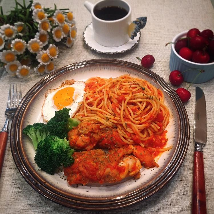 披萨酱鸡腿🍗意面🍝、煎鸡蛋🍳、🍒、☕️ 早上醒来,朋友圈里全是地震了,我还是稳稳的继...