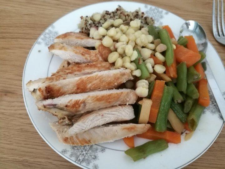 减脂餐:煎鸡胸 炒杂蔬(豆角,杏鲍菇,胡萝卜)藜麦饭