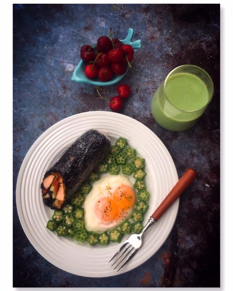 紫糯米鸡肉卷+水煎蛋(好运气,遇到双黄蛋了[偷笑])青汁撞豆+车厘子+秋葵!合计40...