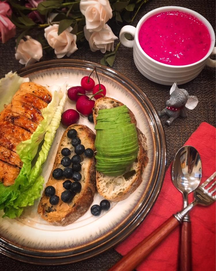 鸡胸肉全麦面包沙拉+火龙果奶昔+红糖粽子!周末有空,自己做了牛油果蛋黄沙拉酱(半个牛油果+两个鸡蛋+半个柠檬汁...