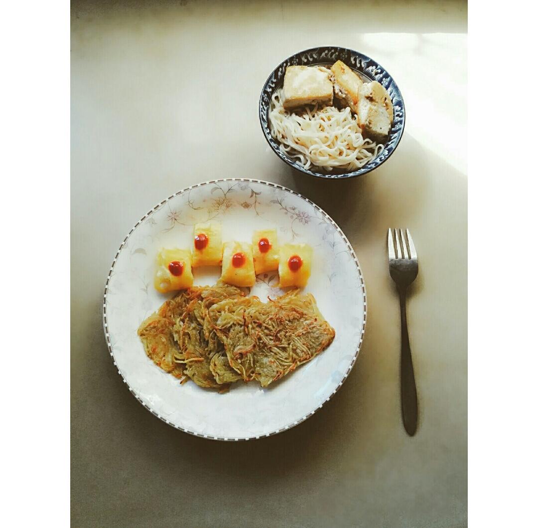 番茄酱玉子烧+土豆丝饼+豆腐素面
