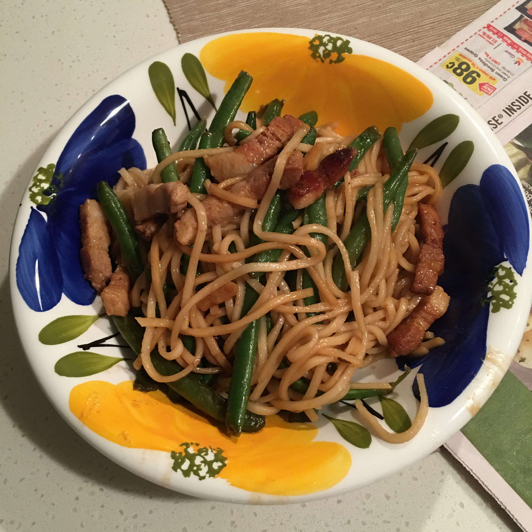 买不到手擀面,煮了干面条加到了五花肉和豆角里,乘出来以后还加了点腊八醋