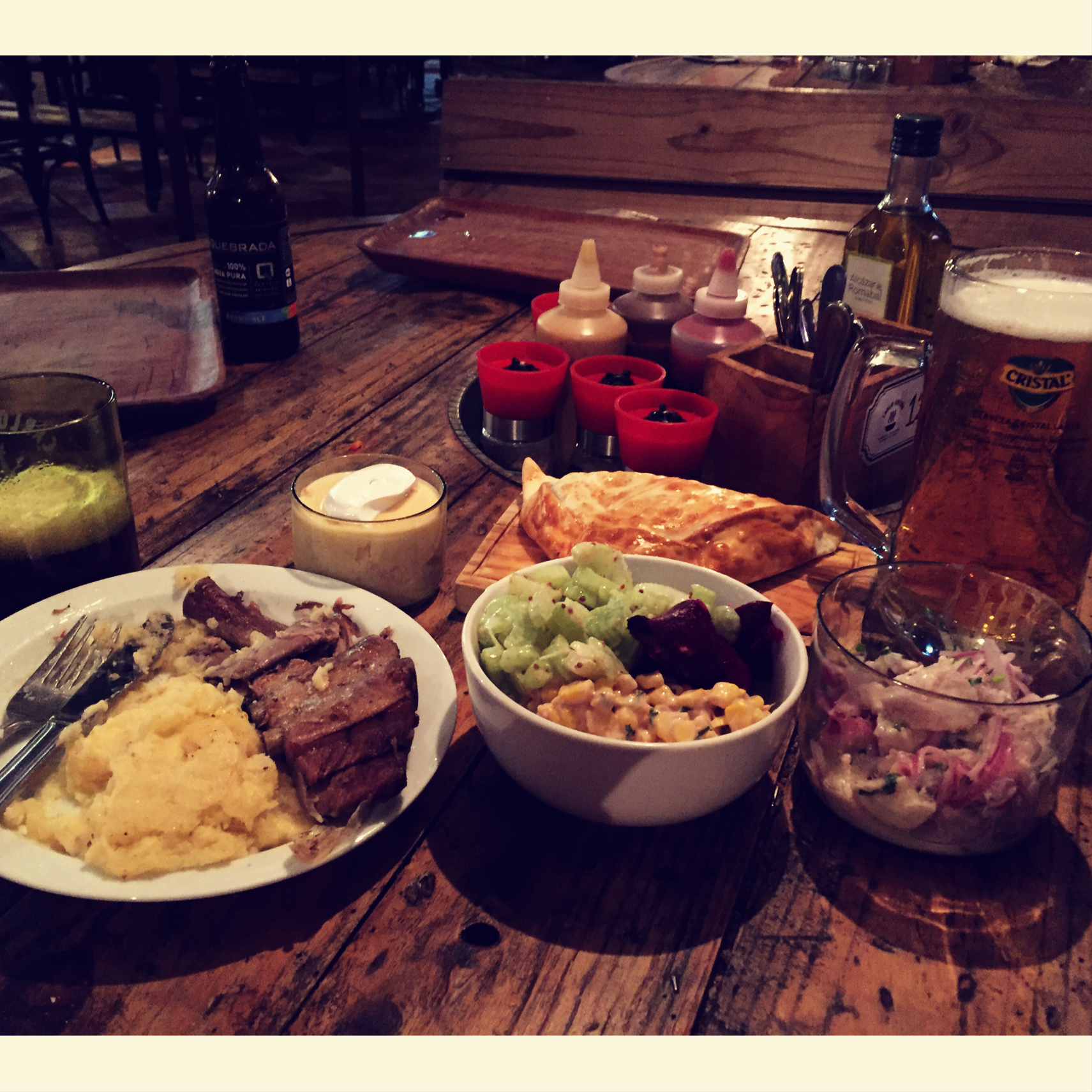 昨天的晚餐外食:猪排骨土豆泥,智利黑橄榄牛肉包子,ceviche(柠檬凉鱼),啤酒,沙拉,甜点是三色牛奶杯蛋糕。