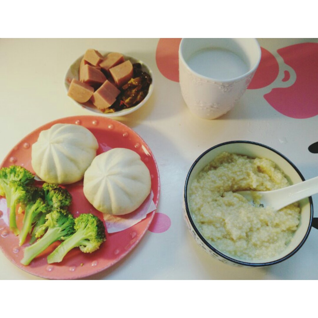 肉包包+小米粥+小菜西蓝花+牛奶