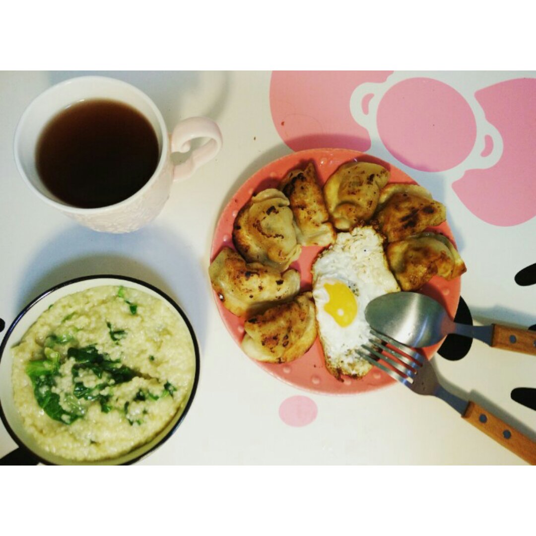 煎饺+太阳蛋+蔬菜粥+薏米红豆水