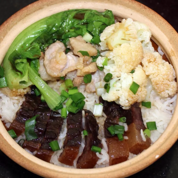 我做成广式砂煲饭,腊肉可用腊肠或腌好的牛肉鸡肉代替,都很好吃