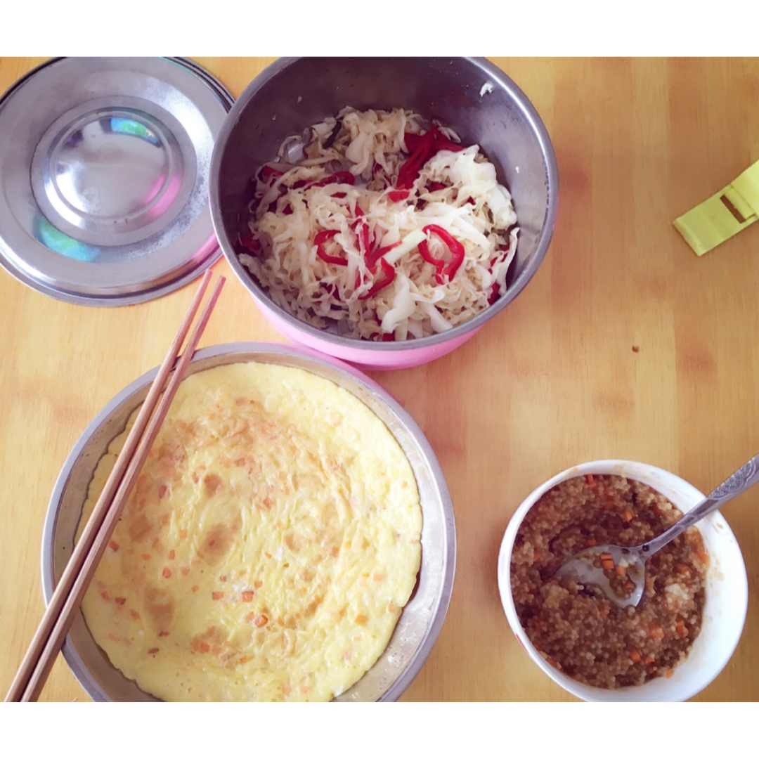 鸡蛋胡萝卜饼➕老爸最爱的小咸菜➕红糖什锦小米粥