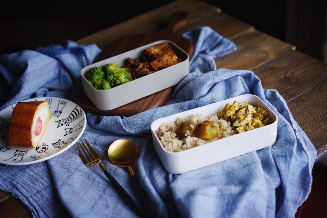 午餐便当,栗子杂粮饭,黑椒杏鲍菇炒鸡蛋,沙茶煎豆腐,凉拌西蓝花。超爱沙茶~