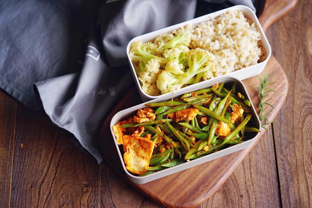 午餐便当,糙米饭,清炒花菜,刀豆鸡蛋炒豆腐。