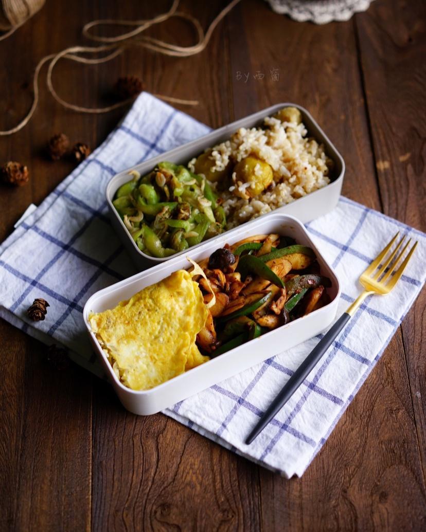 午餐便当,栗子杂粮饭,虾仁烩丝瓜,小银鱼煎蛋,青椒炒蟹味菇。
