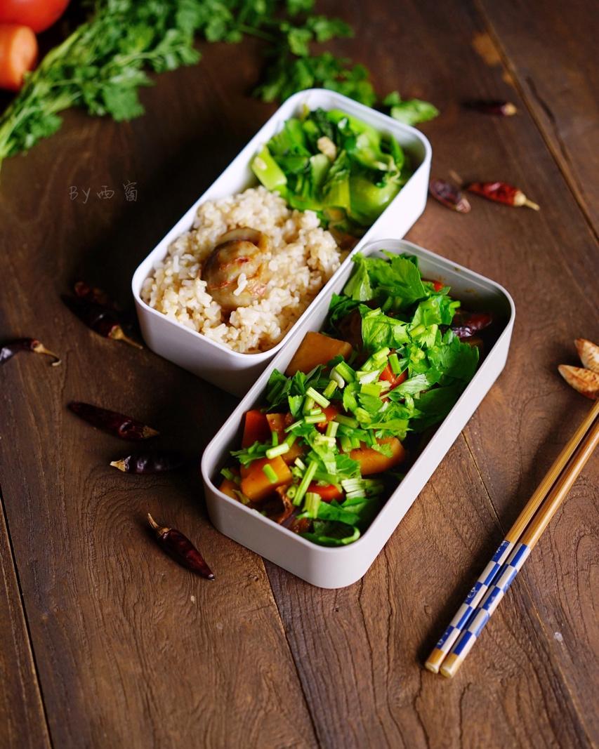 午餐便当,栗子杂粮饭,蒜蓉小白菜,麻辣牛腩。