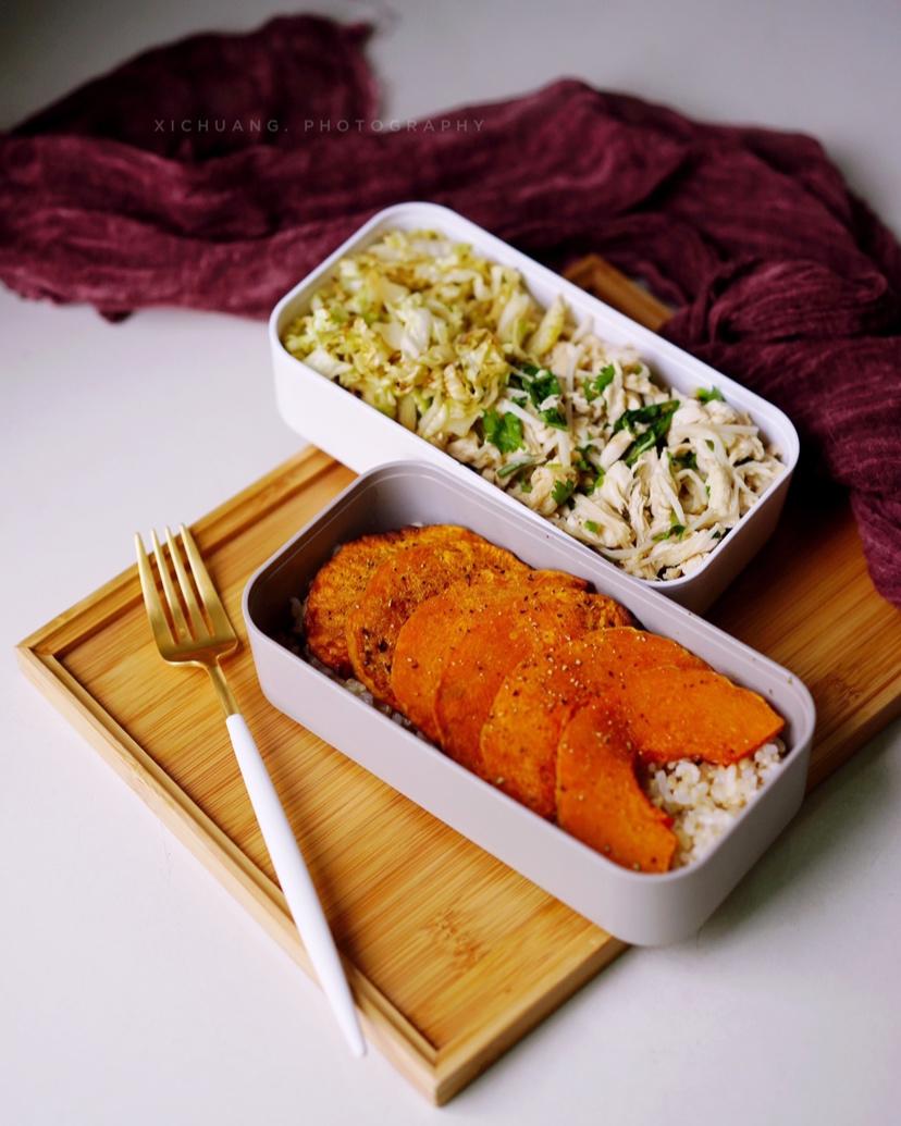 午餐便当,炒包菜丝,凉拌鸡丝,糙米饭,烤南瓜。