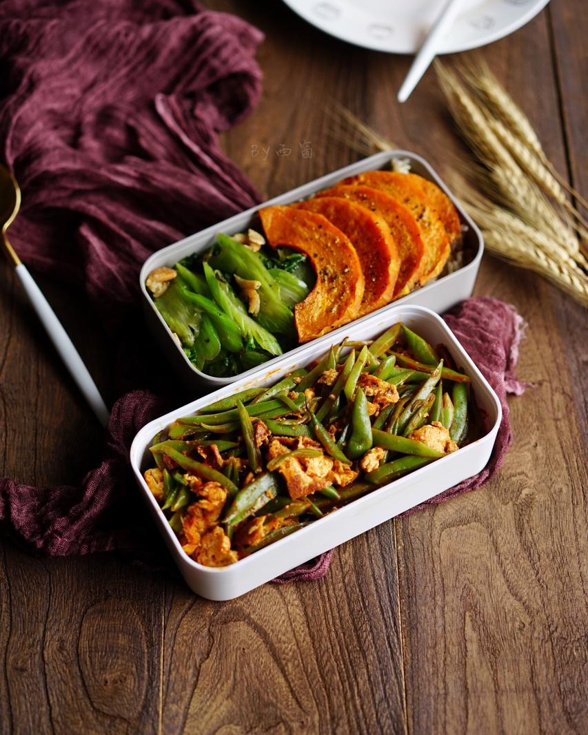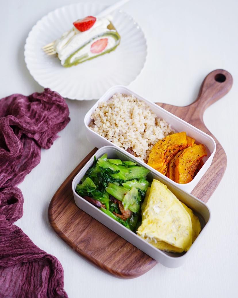 午餐便当,糙米饭,烤南瓜,白灼秋葵,蟹味菇炒蛋。