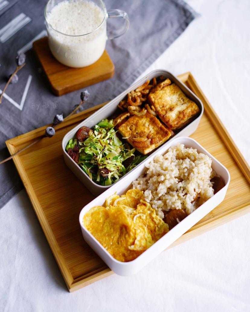 午餐便当 栗子杂粮饭 小银鱼煎蛋 沙茶虾仁豆腐 香肠炒杂菜