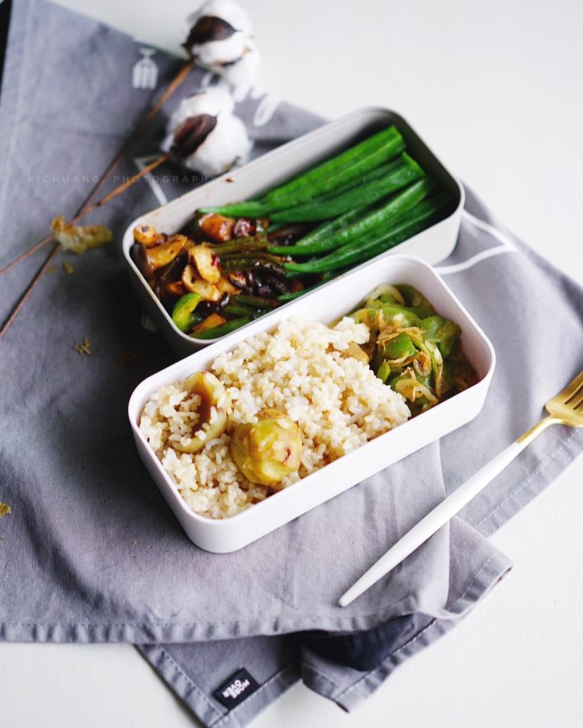 午餐便当 栗子杂粮饭 虾仁炒丝瓜 豆豉青椒杏鲍菇 白灼秋葵 终于把今年的存图清完了 平时...