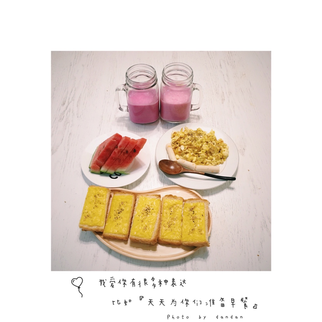 :奶酪吐司脆,西式炒蛋,火龙果奶昔~早安,早餐。