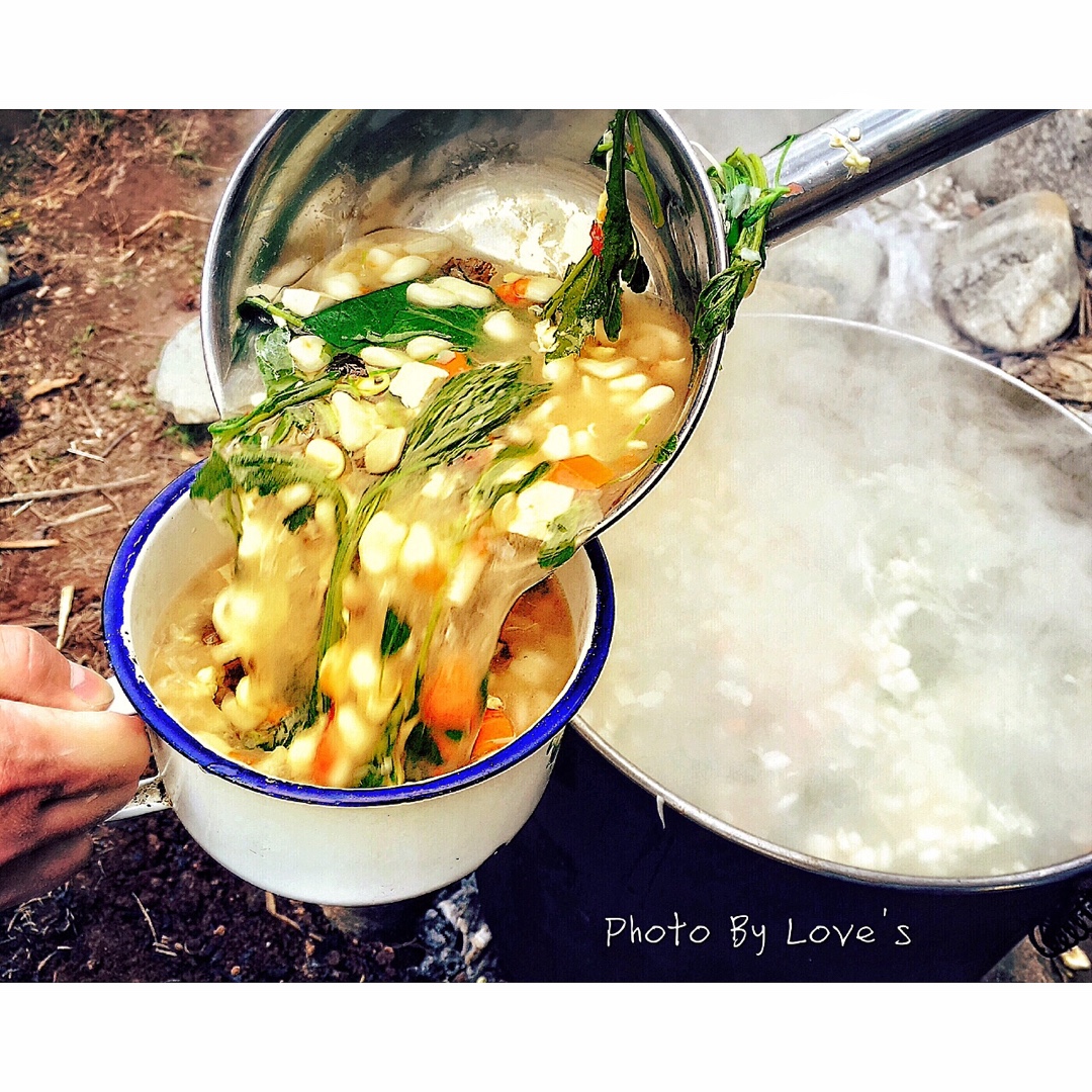 我们拾了柴火,采了野菜,支起大锅,煮了麻食。