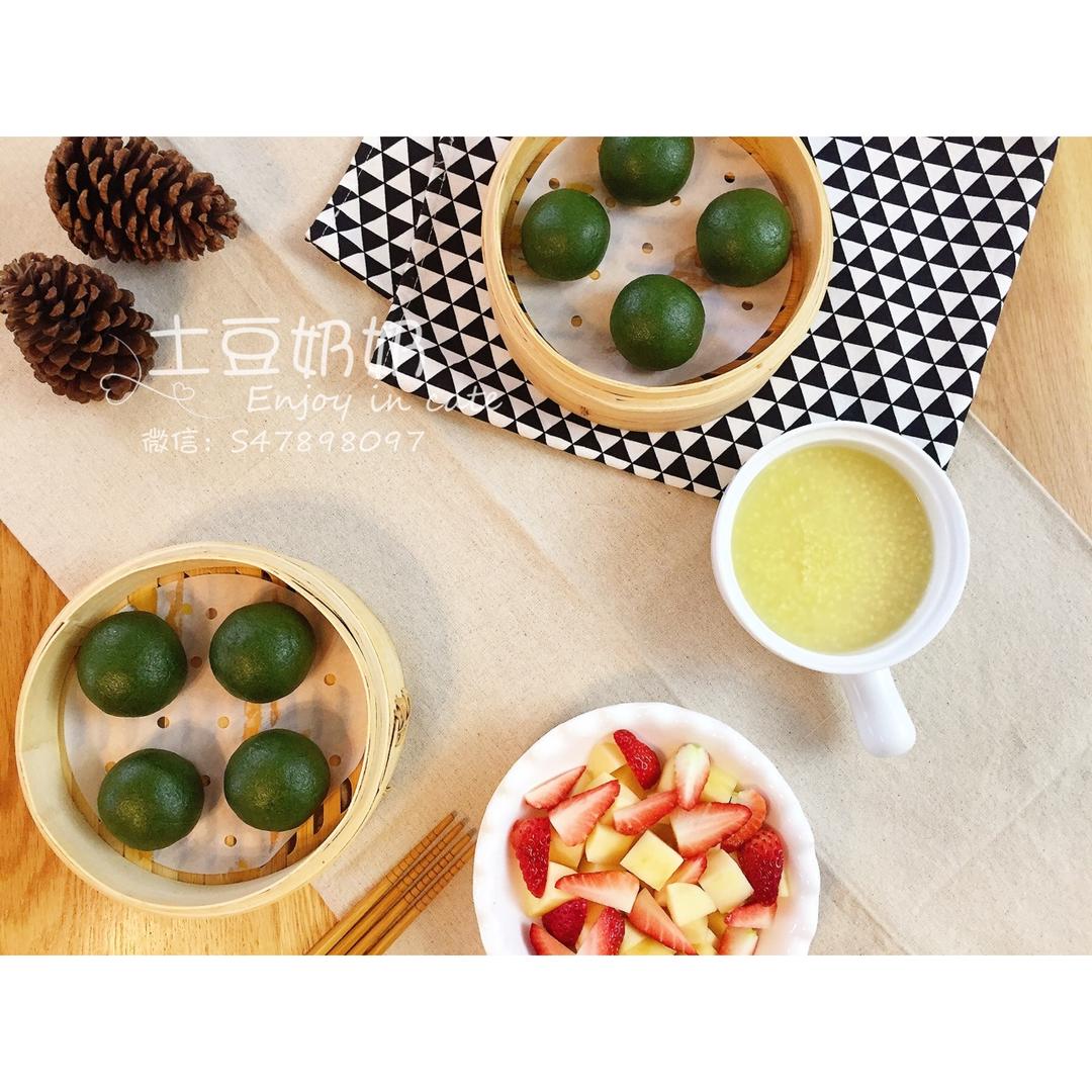 网红蛋黄肉松青团,小米粥,水果盘 #早餐•2017年3...