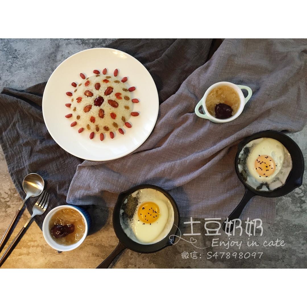 八宝饭,煎蛋,银耳羹