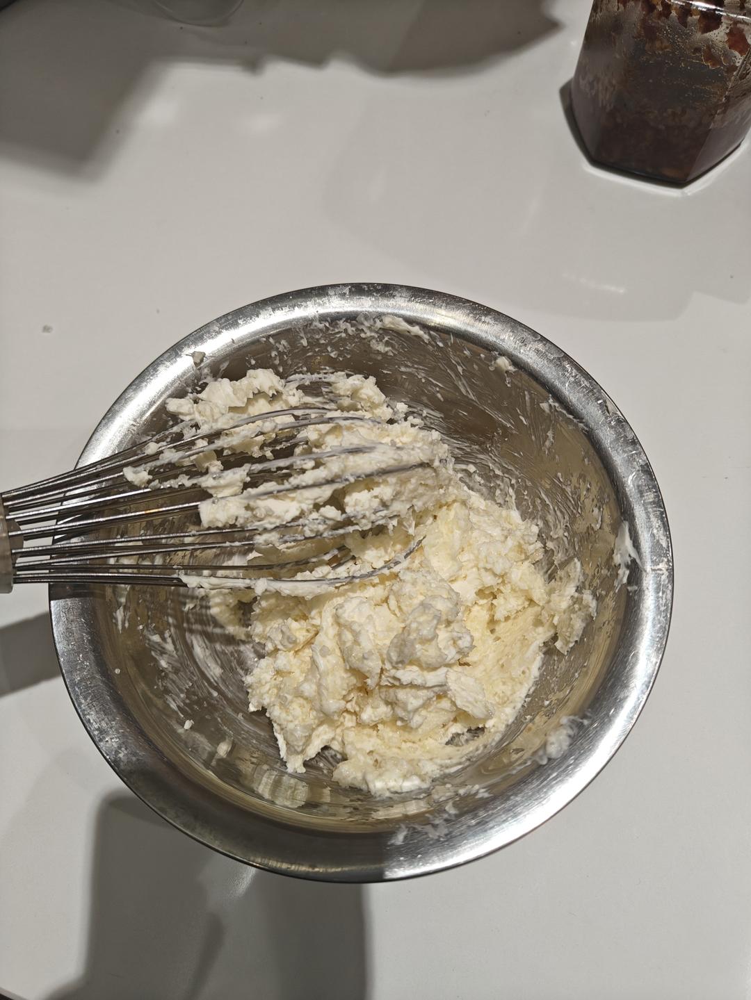 一袋奶油奶酪是200g,我就加了一袋,多加了20g的淡奶油。家里鸡蛋比较小,用了3个全蛋➕一个蛋黄,过筛了六七遍非常细腻...