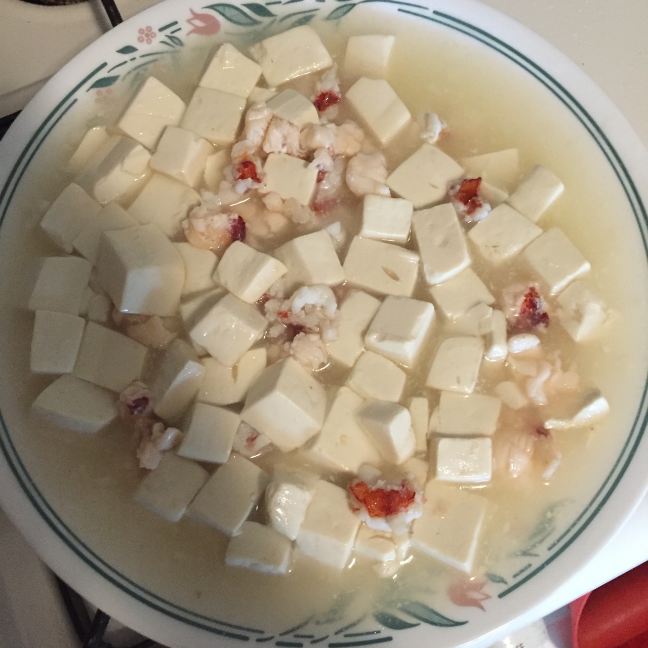 豆腐切的不够小。豆腐也不够嫩…虾用的龙虾代替的。没有葱。豆腐没有焯水。