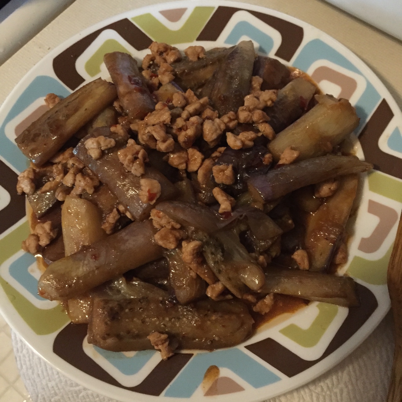 没有姜蒜。葱。小辣椒。茄子炸久了颜色不漂亮。以后先用小的锅子炸一下再炒。肉末切的不够碎。茄子稍微再切小一点点。 #晚餐•...