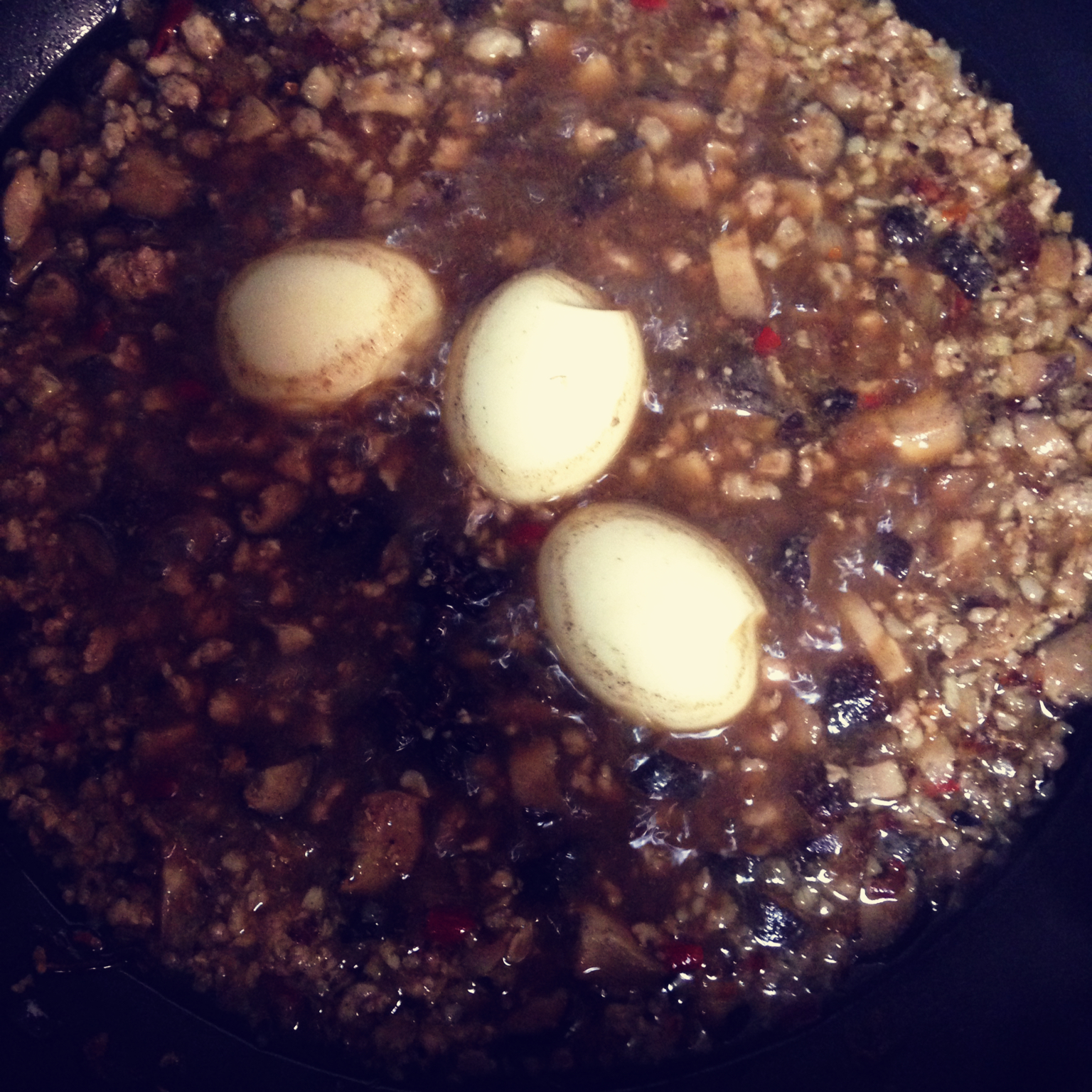 四蒜头蓉,炒,两三匙油葱酥,炒,七朵香菇切丁,炒,一磅猪绞肉,炒,两匙料酒两匙酱油两匙蚝油一匙五香粉少量鸡粉盐,加水加八...