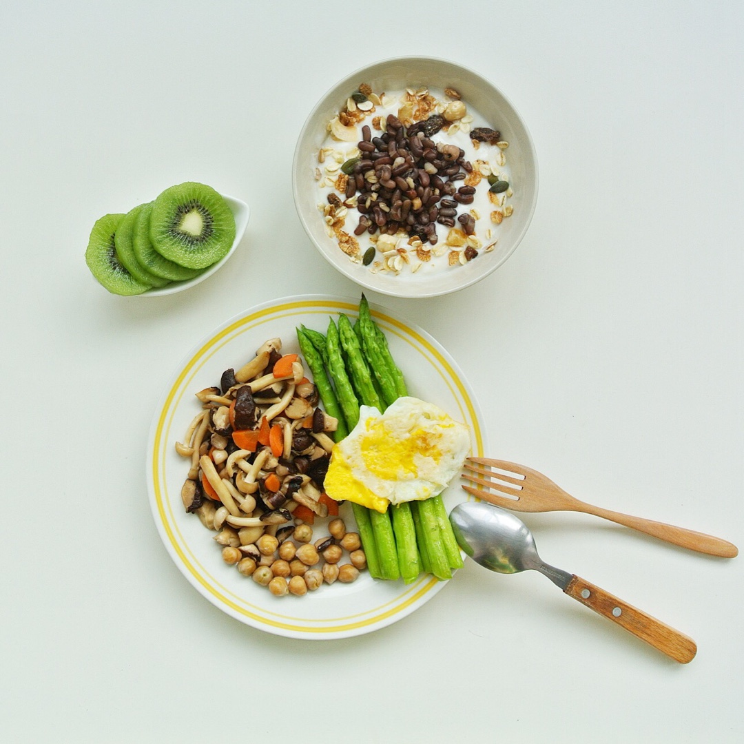 芦笋鸡蛋 菌类胡萝卜鹰嘴豆 红豆燕麦酸奶