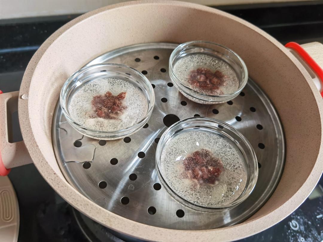 200克粉+300ml水+40克糖,适量煮熟的红豆,把糖融在水里再倒入粉,然后把砵仔糕碗拿出来,到入红豆再倒入粉就可以拿...