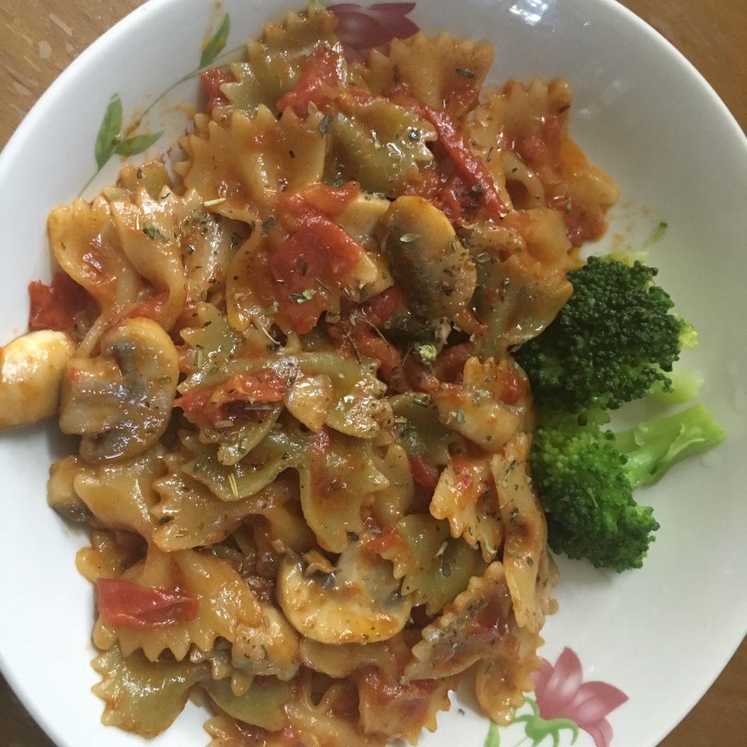 加了罗勒 迷迭香等调味粉 意面里加了蘑菇番茄炒的酱汁