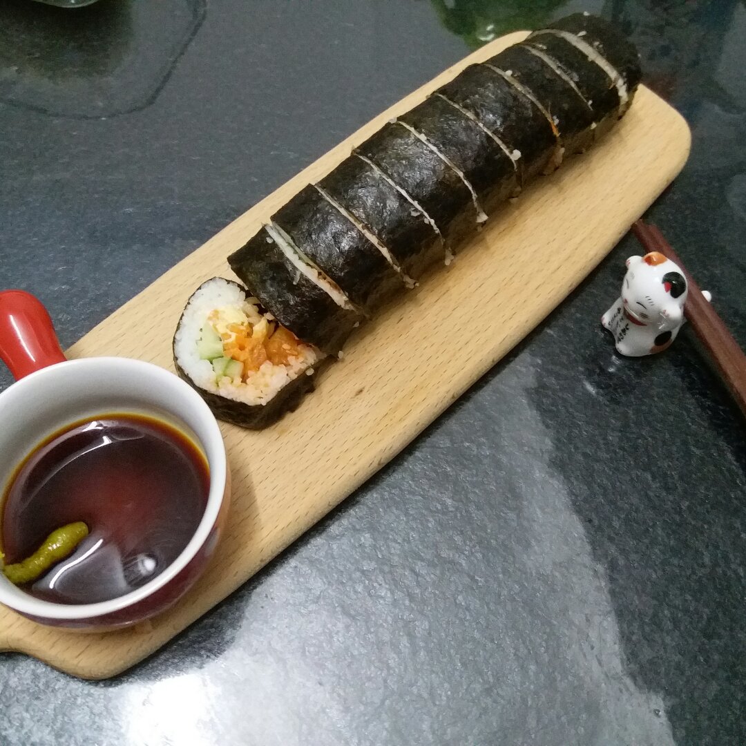 晚饭趁着娃乖已鼓捣好。紫菜包饭的好处不是简单又快手,而且冷吃热吃都能吃