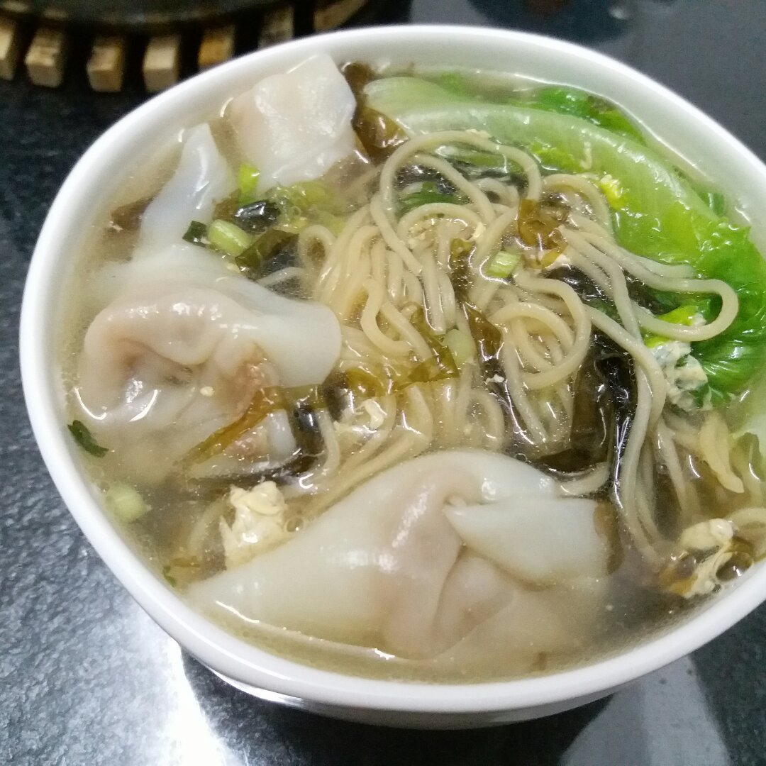 中午大爷不在家,抱着孩子,扔几个小云吞,扔快面,扔点紫菜加个蛋,冰箱里剩了一小...