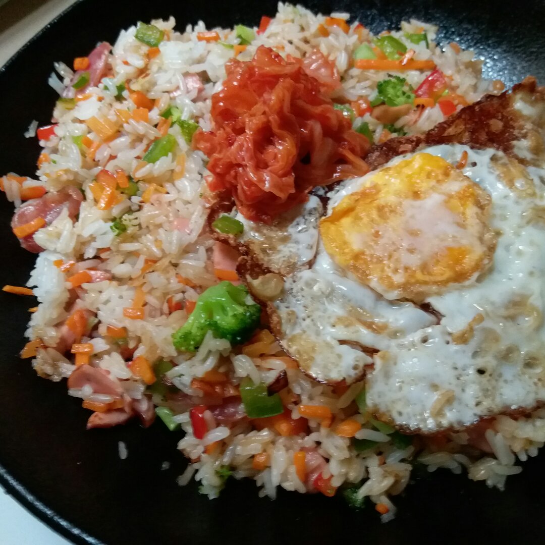 中午自己一个人,昨晚的剩饭加点蔬菜碎炒炒,加个蛋,...