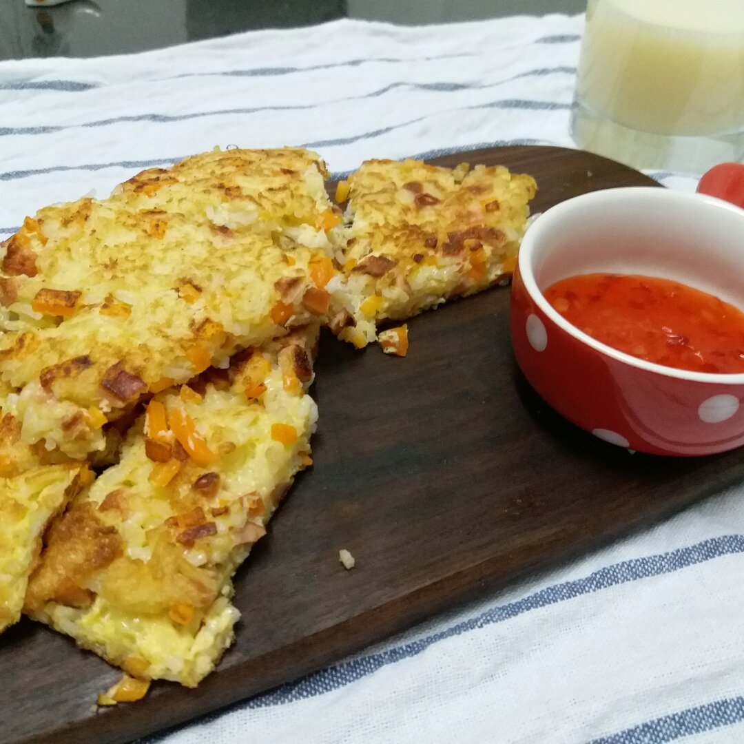 剩米饭加点胡萝卜米,打两个蛋,加点盐,打杯豆浆,一人份早饭...