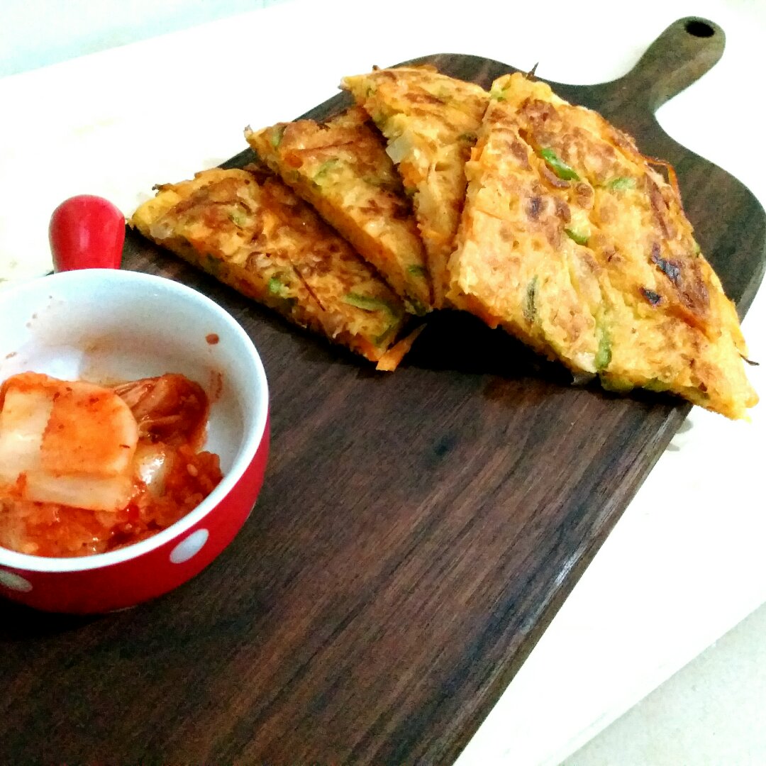 看韩剧看馋了,果断去厨房鼓捣个简易版泡菜饼!边吃边看!