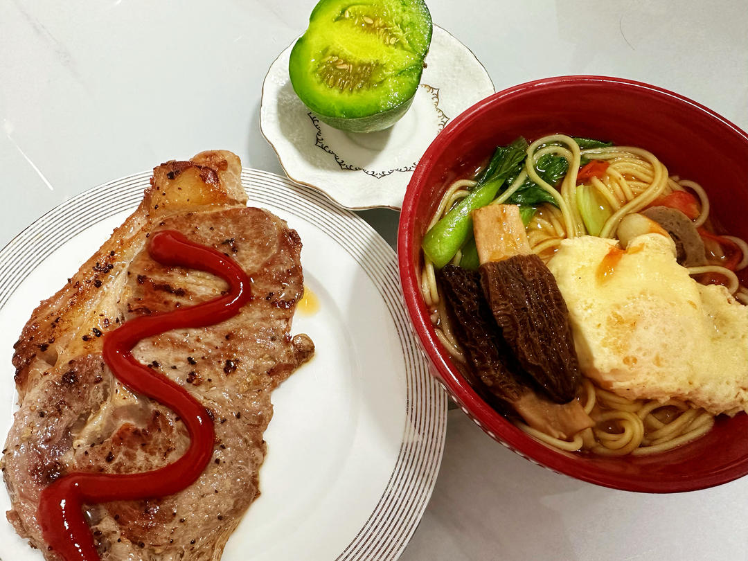 牛排,西红柿羊肚菌鸡蛋面,甜瓜
