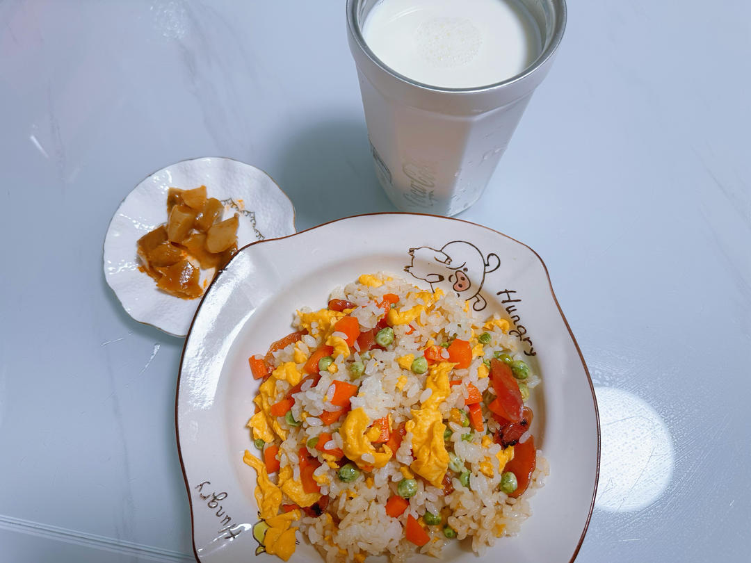 腊肠蛋炒饭,榨菜,牛奶