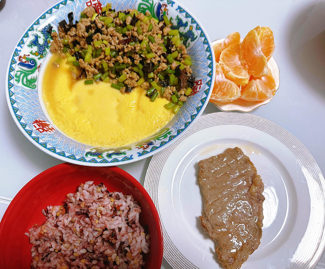 肉沫鸡蛋羹,牛排,杂米饭,橙子