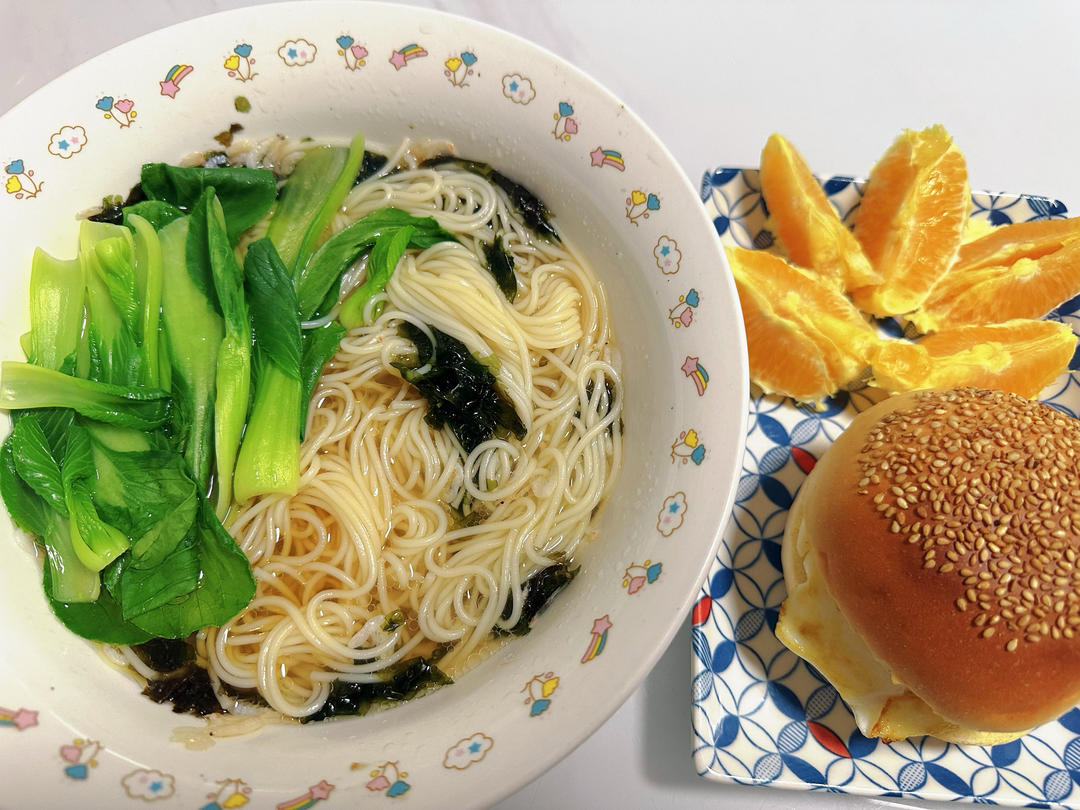阳春面,虾堡,橙子
